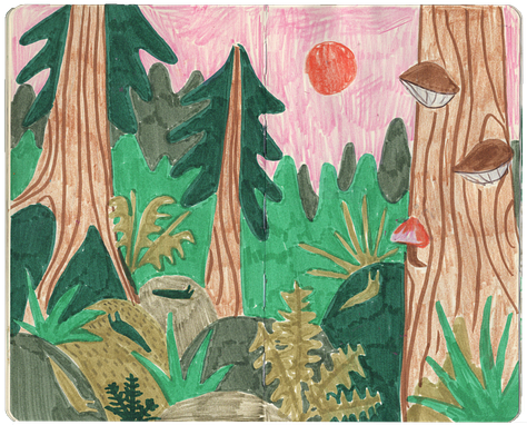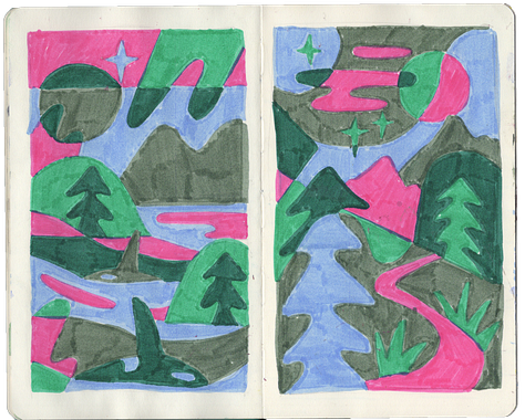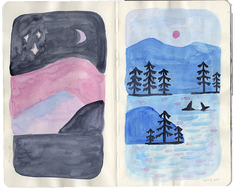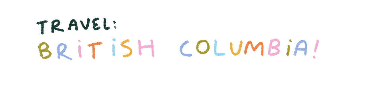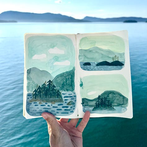 I just got back from a really lovely two week road trip around British Columbia. A fun fact about me is that I went to a small liberal arts university in the mountains of Squamish, BC, and it’s where I met my husband Andrew, and so many of our friends. This trip, we got to spend some time on Vancouver Island & in Squamish. We surfed in Tofino with Idea Camp friends, watched other friends get married on Quadra Island, mountain biked in Squamish, and saw orcas and sea otters and bears! I had a lot of fun trying to capture the magic of British Columbia’s rain forests & ocean in my sketchbook.