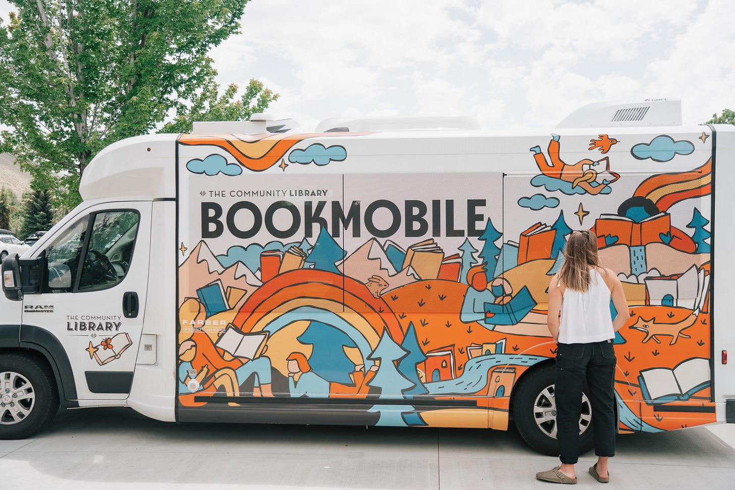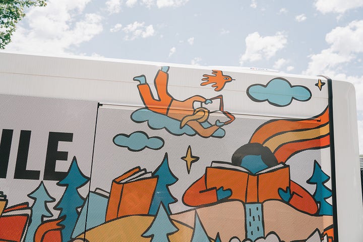 When my local library reached out to me about designing the art wrap for their new bookmobile, I was over the moon. The bookmobile is a library on wheels that brings books to kids all around the county. I got to create an illustrated world of books, people, and nature that wraps around the entire bus!
